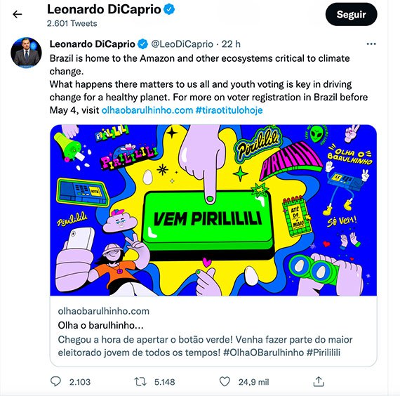 “O Brasil abriga a Amazônia e outros ecossistemas críticos para as mudanças climáticas. O que acontece lá é importante para todos nós e o voto dos jovens é fundamental para impulsionar a mudança para um planeta saudável. Para saber mais sobre o registro de eleitores no Brasil antes de 4 de maio, visite http://olhaobarulhinho.com #tiraotitulohoje” escreveu DiCaprio.