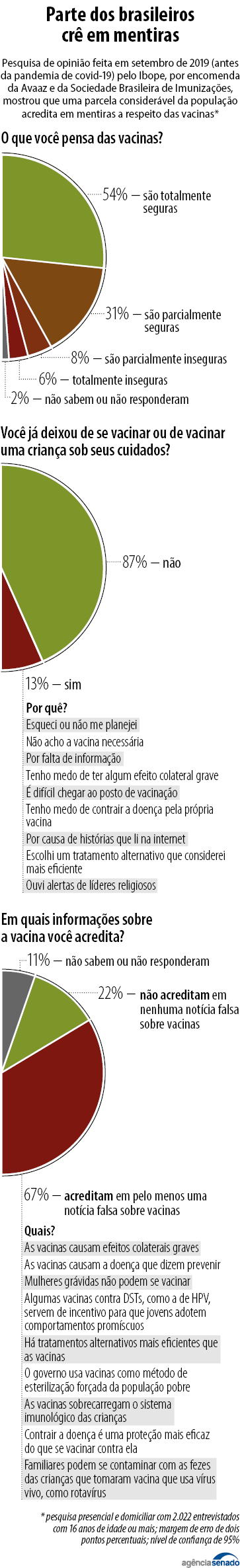 O senador Romário (PL-RJ), por sua vez, redigiu uma proposta que obriga os serviços de saúde a sempre analisar a caderneta de vacinação de todos os pacientes e aplicar os imunizantes atrasados (PL 5.094/2019). Isso ocorreria em consultas e hospitalizações, por exemplo. O relator do projeto, senador Paulo Paim (PT-RS), recomenda que a medida seja aprovada (veja vídeo abaixo).