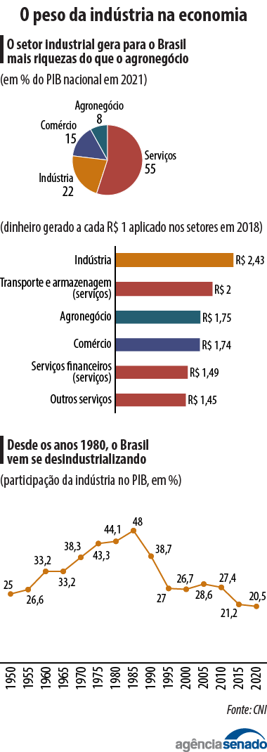A indústria é capaz de gerar mais riquezas do que o agronegócio. As fábricas exigem mais empregados do que o campo. A qualificação deles precisa ser mais alta, o que estimula a educação e eleva os salários. Esses pagamentos permitem que os trabalhadores consumam mais mercadorias e serviços, estimulando o setor produtivo e gerando receita tributária para o governo federal, os estados e os municípios.