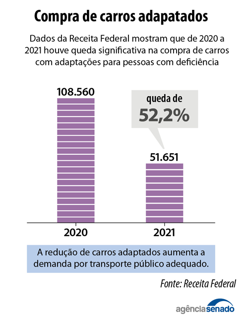 No entanto, dados da Receita Federal mostram que de 2020 a 2021 houve queda de 52,2%, na venda de carros para pessoas com deficiência. Em 2020 108.560 veículos adaptados foram comercializados. Em 2021 foram apenas 51.651. Se faltam carros, aumenta a demanda por por transporte público adequado.