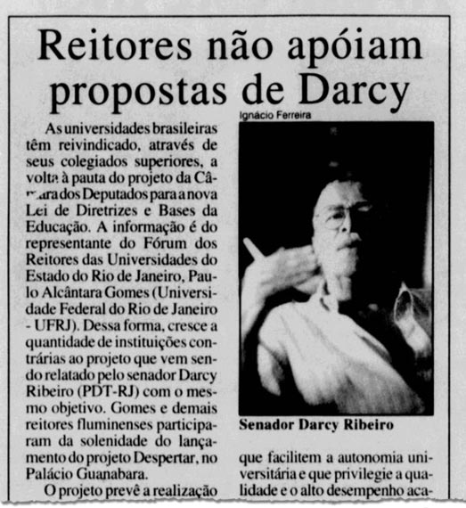 Foi no início desse ano que Darcy Ribeiro foi incumbido da relatoria da nova Lei de Diretrizes e Bases da Educação. Era uma missão auspiciosa. O Brasil ainda engatinhava em uma nova ordem constitucional e precisava redefinir os termos de quase todas as suas políticas cívicas. A LDB seria o alicerce para a alfabetização, o cultivo dos jovens, a qualificação profissional, a formação superior.