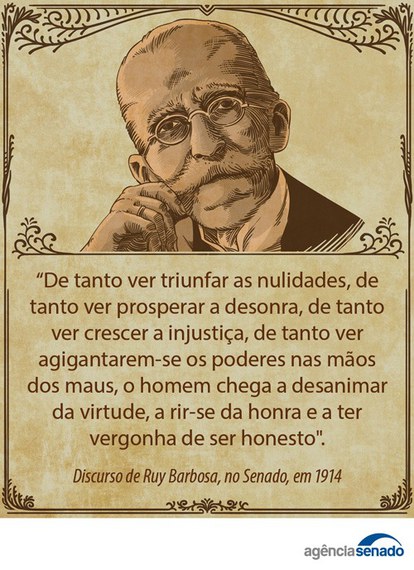 O busto de Ruy Barbosa tem sido testemunha dos trabalhos legislativos no Plenário do Senado ao longo dos anos. Considerado o patrono do Senado, Ruy Barbosa foi um homem de variados trabalhos. Jurista, diplomata, político, tradutor e jornalista. Sua atuação destacada em diversas áreas evidencia sua importância para o país, mesmo 100 anos após sua morte. Ruy Barbosa de Oliveira nasceu no dia 5 de novembro de 1849, em Salvador (BA), e morreu no dia 1º de março de 1923, em Petrópolis (RJ). Ao longo de seus 73 anos de vida, inscreveu seu nome no rol dos intelectuais mais importantes da história do Brasil.