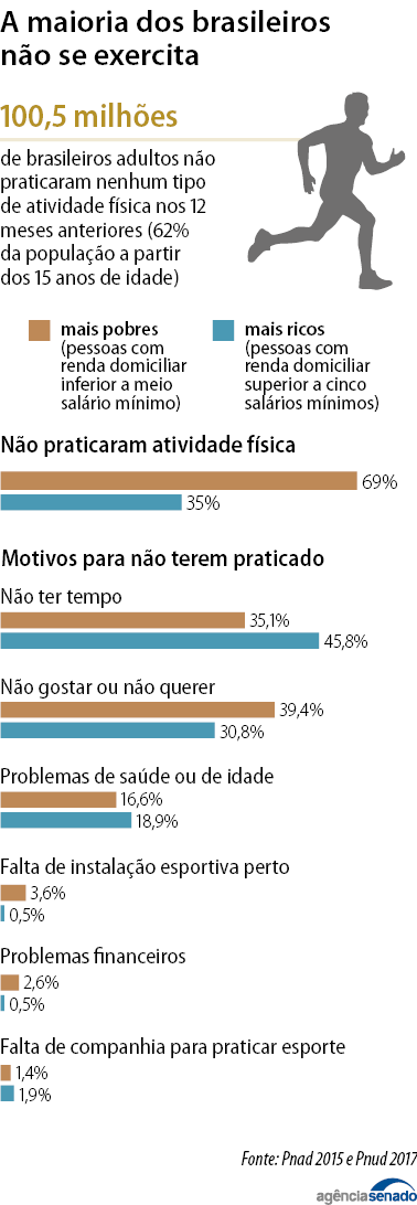 A população nacional é sedentária. Dados do Instituto Brasileiro de Geografia e Estatística (IBGE) mostram que 65% dos brasileiros adultos não fizeram nenhum tipo de atividade física nos 12 meses anteriores. Quanto mais pobre, menos escolarizada e mais velha é a pessoa, mais os exercícios estão fora de sua vida.