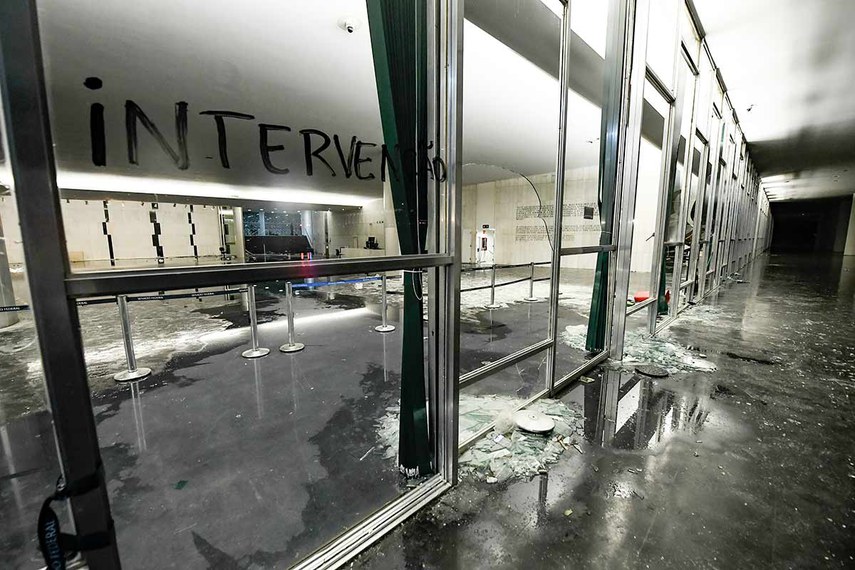 08.01.2023 Estragos na fachada do Congresso Nacional, invadido e depredado por vândalos. Ações são alvo de Comissão Parlamentar Mista de Inquérito.