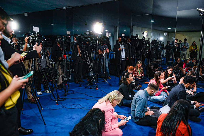 19.07.2023 Jornalistas acompanham coletiva de imprensa de senadores no Salão Azul, entre a Presidência e o Plenário do Senado.