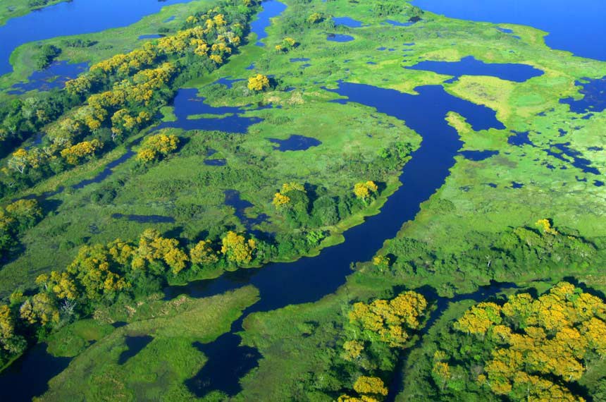 Numa segunda escala, a continental, o desmatamento na Amazônia também contribui para a redução das quedas pluviais, atingindo em cheio a bacia hidrográfica que forma o Pantanal. Os rios pantaneiros têm suas nascentes em outros biomas. Da Amazônia, as águas chegam à planície pantaneira por meio dos rios voadores, como são chamados os cursos de água atmosféricos.