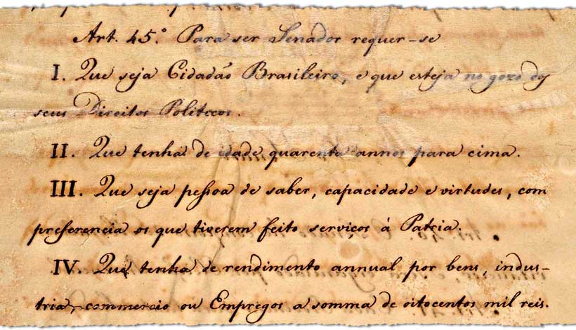 Para redigir a Constituição de 1824, o Marquês de Caravelas se valeu de seus conhecimentos jurídicos e históricos e tornou o Brasil pioneiro em certos aspectos. Embora cogitado no início da Revolução Francesa, o Senado escolhido pelo rei em lista tríplice não chegou a ser aprovado pelos revolucionários. O Poder Moderador também existia apenas no mundo das ideias, arquitetado pelo pensador político suíço Benjamin Constant.