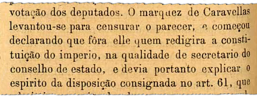 — Se o Senado fosse eleito simplesmente como é a Câmara dos Deputados e temporário como ela, haveria alguma diferença entre uma câmara e outra? Nenhuma. Não teríamos, verdadeiramente, mais que uma câmara, isto é, o absolutismo popular, porque nada haveria que embaraçasse os efeitos de uma facção que nessa câmara única se introduzisse, nada havia que fizesse face à demagogia. A autoridade do monarca desaparecia. O governo representativo é o governo do balanço, cada um dos Poderes tem em si uma força de contrapesar os excessos do outro, e dessa maneira se conserva o equilíbrio de todas as peças da máquina social.