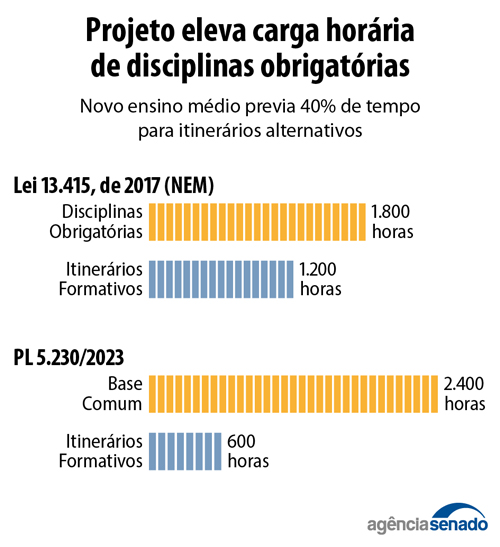 O total de horas do ciclo é de 3 mil — são previstas 5 horas em cada um dos 200 dias letivos de cada ano. Para complementar a carga de 2,4 mil horas de formação geral básica, os alunos ainda vão escolher áreas para aprofundar os estudos. Pelo projeto, serão 600 horas em itinerários formativos (em vez das atuais 1,2 mil), que deverão proporcionar o aprofundamento em alguma das áreas de conhecimento.