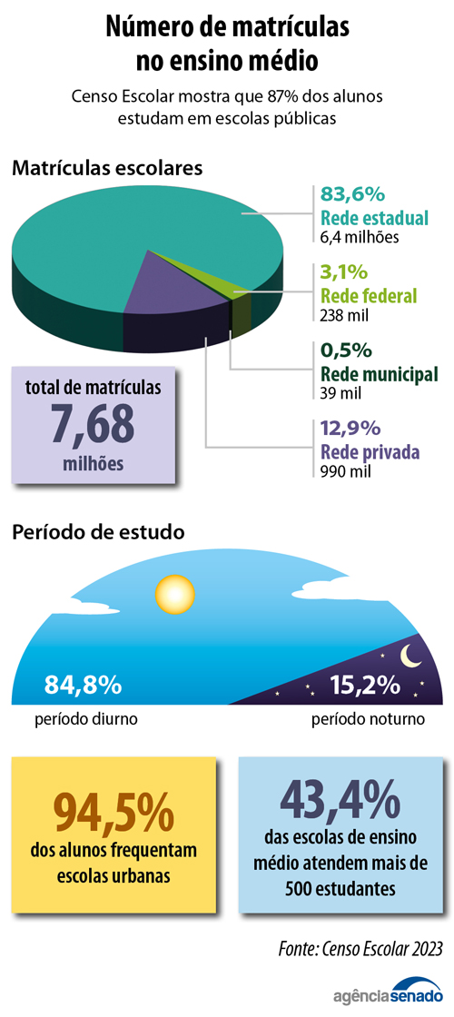 As mudanças em discussão podem atingir 7,7 milhões de alunos. Foi esse o número de matrículas do ensino médio registradas em 2023, segundo dados do último Censo Escolar, divulgado em fevereiro pelo Ministério da Educação. Os dados mostram que a grande maioria dos estudantes do ensino médio (87,1%) está na rede pública. Já os alunos matriculados em escolas particulares representam 12,9%.
