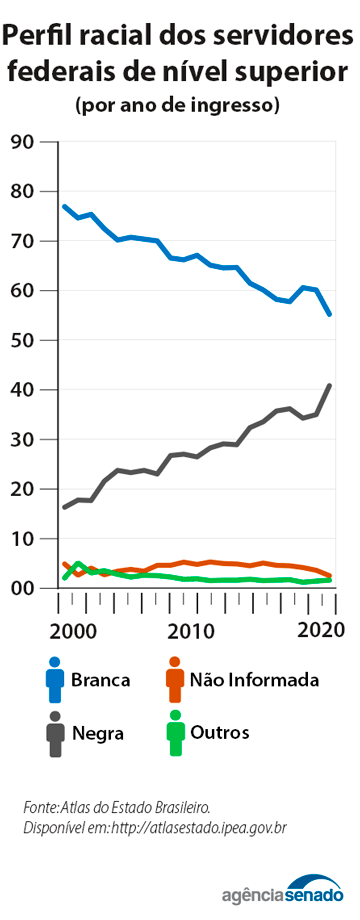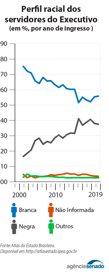 Ao analisar os dados sobre servidores ativos que ingressaram a partir das últimas duas décadas no serviço público civil do Executivo federal, o que corresponde a pouco mais de 325 mil funcionários permanentes, a pesquisadora constatou que os servidores que entraram no ano de 2000 eram majoritariamente brancos (76,5%), tendência que foi se alterando ao longo do tempo.