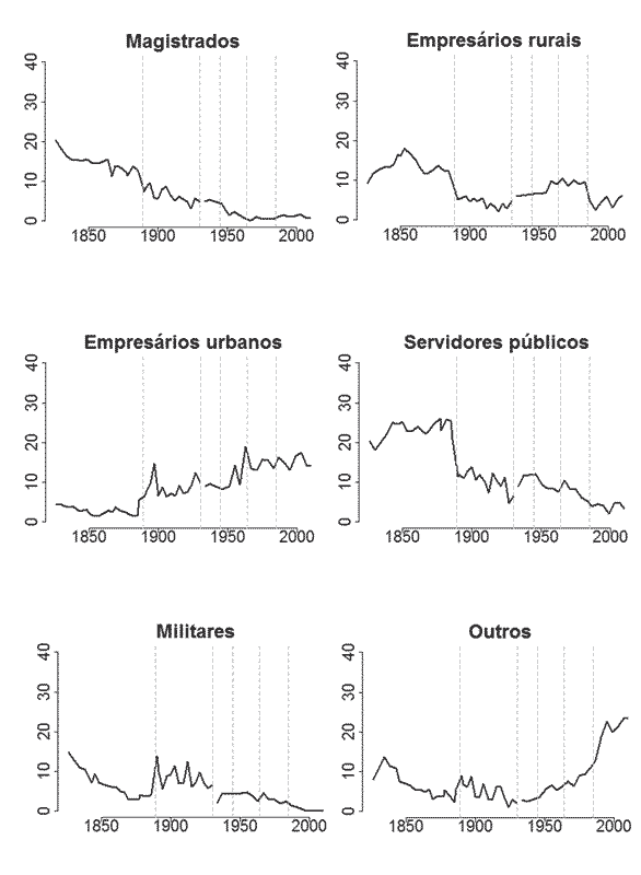 A pesquisa mostra que a proporção de juízes caiu gradativamente ao longo destes 200 anos. A de proprietários rurais e a de militares graduados também.