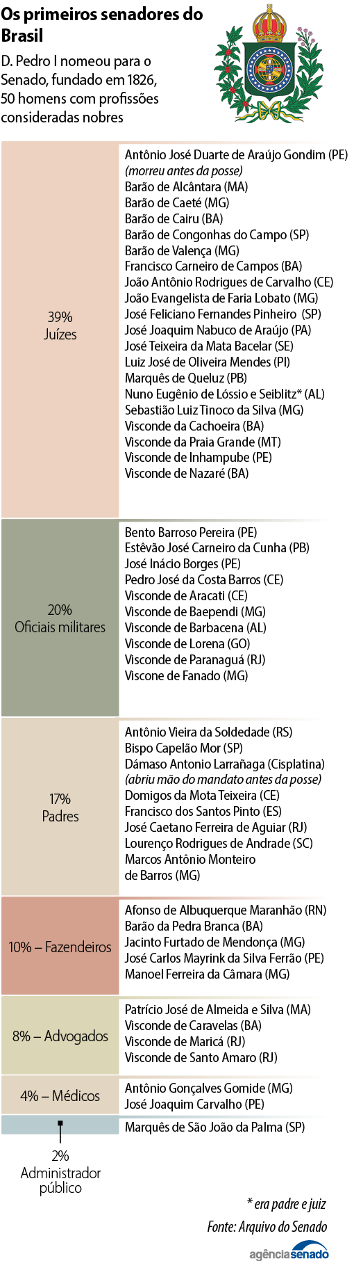 Quando o Senado foi inaugurado, em 1826, todos os seus 49 parlamentares exerciam as profissões mais privilegiadas do Brasil imperial. Eles eram, basicamente, juízes, advogados, oficiais militares, padres, fazendeiros e médicos.
