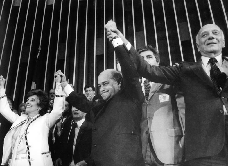 Graças às manobras políticas e legais dos anos anteriores e aos resquícios do seu poder autoritário, o governo tinha a maioria no Colégio Eleitoral. Mas a erosão da ditadura já era irreversível. Tancredo conseguiu atrair para seu campo a Frente Liberal, uma dissidência do PDS descontente com a indicação de Maluf como candidato. A união formou a Aliança Democrática e deu a Tancredo seu vice, o senador José Sarney, que havia sido presidente da antiga Arena. Sarney migrou para o PMDB, enquanto a Frente Liberal formou seu próprio partido, o PFL.