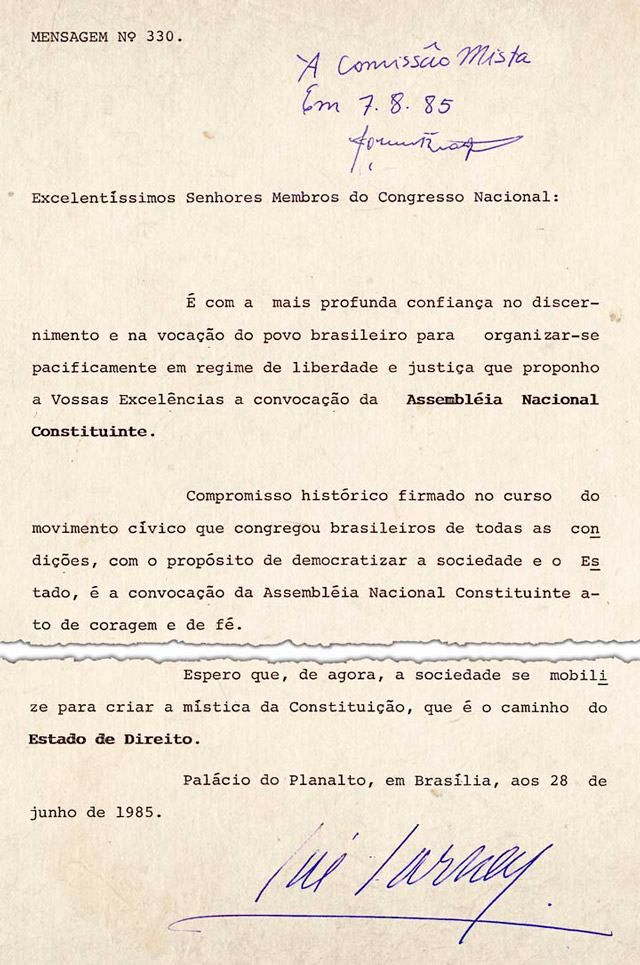 Em 27 de novembro de 1985, o Congresso Nacional promulgou a Emenda Constitucional 26, que determinou a criação da Constituinte, a ser formada por senadores e deputados com a missão de redigir a Carta democrática que sepultaria a ordem política, econômica e social imposta pela ditadura militar (1964-1985).