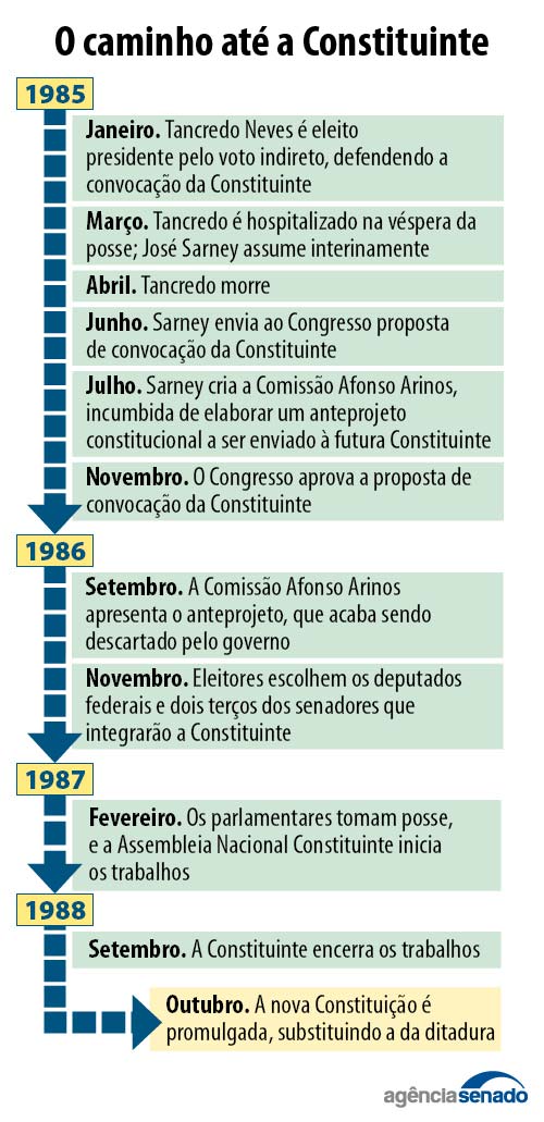 Entre a convocação e a instalação, houve 14 meses de intensa movimentação, incluindo a eleição dos senadores e deputados constituintes, e a eliminação de boa parte do “entulho autoritário”, leis da ditadura que poderiam comprometer o processo constitucional. Em 3 de outubro de 1988, nasceu a chamada Constituição Cidadã.