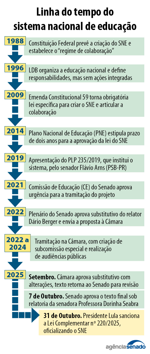 Com essa perspectiva, a Comissão de Educação do Senado aprovou regime de urgência em 2021. O relatório, um texto alternativo apresentado pelo então senador Dário Berger (SC), foi aprovado em março de 2022. Na Câmara dos Deputados, o projeto tramitou por mais de três anos, passando por audiências públicas e seminários estaduais organizados pela Subcomissão sobre o Sistema Nacional de Educação (SubSNE).