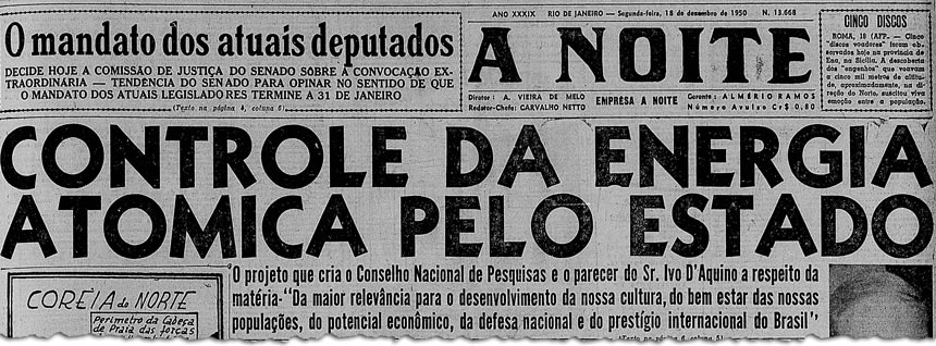 Um dos artigos da lei de 1951 dizia que, entre outras atribuições, o CNPq deveria incentivar a prospecção de minerais radioativos no território nacional. Outro dispositivo proibia a exportação de urânio e tório. Um dos temores do governo era que a Argentina tomasse a dianteira e dominasse essa tecnologia antes do Brasil.