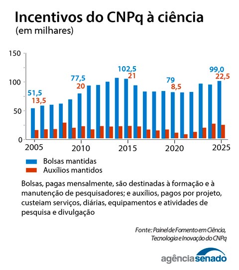 No ano passado, o CNPq tinha 99 mil bolsas de pesquisa vigentes. O número ficou acima das 91,5 mil de 2024 e bem perto das 102,5 mil de 2014, quando as bolsas alcançaram o número recorde de todos estes 75 anos — em razão do Ciência sem Fronteiras, programa que financiou o intercâmbio de estudantes de graduação e pós-graduação no exterior.