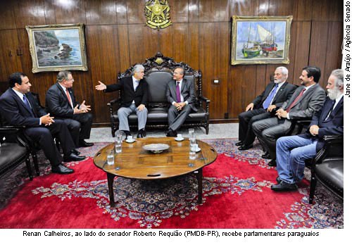 O presidente do Senado, Renan Calheiros, recebeu na manhã desta quinta-feira (14) um grupo de parlamentares do Paraguai. Eles pediram a Renan que convide congressistas brasileiros para serem observadores nas eleições que ocorrem no próximo dia 21 de abril, quando será eleito o novo presidente do país. O grupo foi acompanhado pelo senador Roberto Requião (PMDB-PR), que preside a representação brasileira no Parlamento do Mercosul (Parlasul).