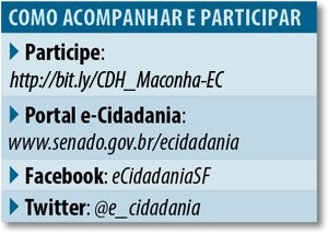 O público também pode participar do debate por meio do portal e-Cidadania. Também é possível a interação pelo Facebook, pelo Twitter e pelo Alô Senado (0800-612211). As informações sobre a audiência estão publicadas em um site criado pelo senador Cristovam Buarque (PDT-DF), que é relator da sugestão que trata da regulação da maconha, com o objetivo de ampliar e aprofundar a discussão sobre o tema.