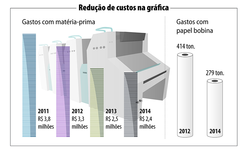 O levantamento traz outros números expressivos. Como o montante de R$ 1 milhão usado para custear 414,3 mil quilos de papel-bobina, em 2012. Dois anos mais tarde, em 2014, a economia já era notória. Foram gastos R$ 653,4 mil para a aquisição de 279,1 mil quilos desse item.