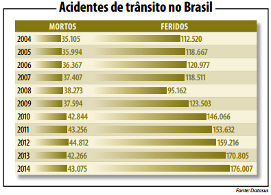 O Ministério da Saúde confirma: foram 43.075 óbitos e 201.000 feridos hospitalizados em 2014 em acidentes de trânsito. Além disso, 42.500 indenizações por morte e mais de 515.000 por invalidez foram pagos pelo seguro DPVAT — aquele que todo proprietário de veículo é obrigado a renovar anualmente para cobrir eventuais despesas com danos pessoais causados por acidentes.