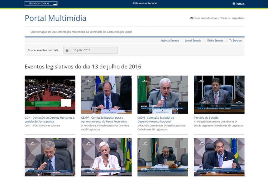 A Secretaria de Comunicação Social do Senado lançou nesta quarta-feira (20) o Portal Multimídia, onde estão disponíveis para consulta online, download e compartilhamento em redes sociais os vídeos e áudios das reuniões das comissões e das sessões plenárias registrados pela Rádio Senado e TV Senado. Basta acessar o Portal de Notícias do site do Senado na internet e, logo na página inicial, junto com as matérias jornalísticas da Agência, TV Senado e Rádio sobre o trabalho do Senado e dos senadores, haverá um link para a área de multimídia, que reúne a íntegra ou trechos das reuniões das comissões e sessões plenárias, a partir de 2 de maio deste ano. Tudo pode ser acessado em computador, tablet ou celular.