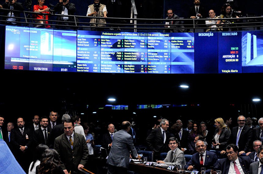 Por 59 votos a 21, o Plenário do Senado decidiu rejeitar as questões preliminares e manter os argumentos do relatório do senador Antonio Anastasia (PSDB-MG). A votação separada dessa primeira parte do relatório que recomenda a perda de mandato da presidente afastada, Dilma Rousseff, foi requerida por senadores do PT.