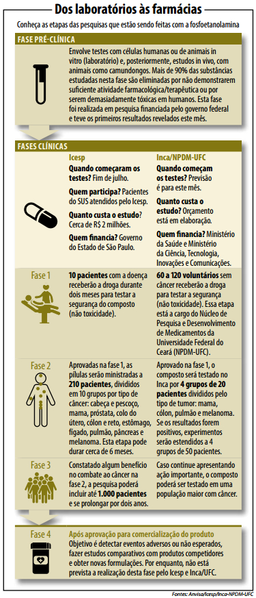 Esse estágio foi dispensado na pesquisa do Icesp pelo fato de a fosfoetanolamina vir sendo ministrada há anos a pacientes com câncer. Mesmo assim, o estudo iniciado no final de julho começou pela fase clínica 1, que visa testar a segurança da droga na ingestão das pílulas por seres humanos. Os primeiros resultados da fase atual devem sair em dois meses , mas todas as etapas da pesquisa previstas para antes da comercialização podem levar cerca de dois anos.