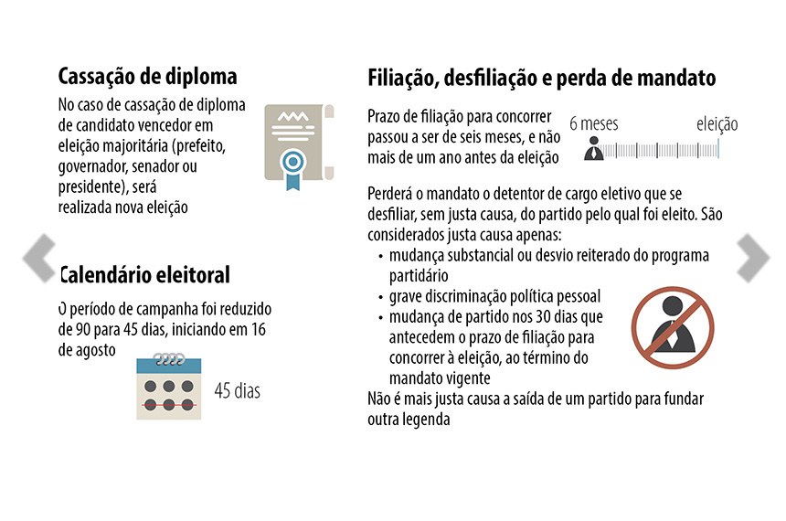 Passado o processo de impeachment, os eleitores se preparam para escolher prefeitos e vereadores em outubro. O primeiro turno será no dia 2 e o segundo — que pode ocorrer nas cidades com mais de 200 mil eleitores —, no dia 30. As Leis 12.891/2013 e 13.165/2015 promoveram alterações nas regras eleitorais que começam a valer este ano. As duas são consideradas minirreformas eleitorais.