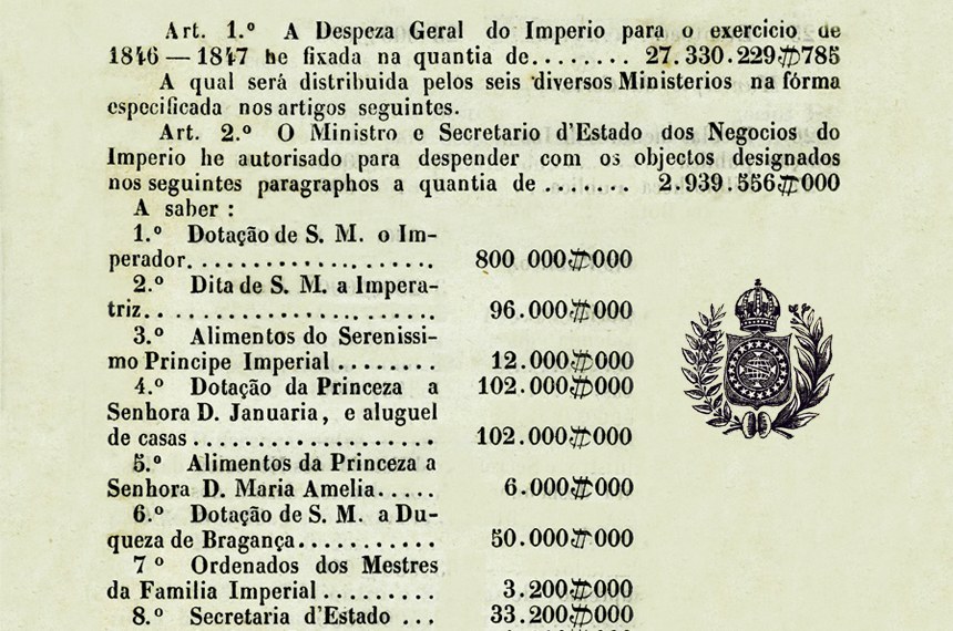Das tantas cifras elencadas na coluna das despesas, a primeira era invariavelmente a “dotação de sua majestade o imperador”. Segundo um decreto de 1840, esses recursos eram “destinados para todas as despesas de sua imperial casa, reparos de palácios e quintas, serviço e decoro do trono; não compreendendo, porém, as despesas da Capela Imperial, da Biblioteca Pública e das aquisições e construções de palácios que a nação julgar conveniente para a decência e o recreio do imperador e sua augusta família”.