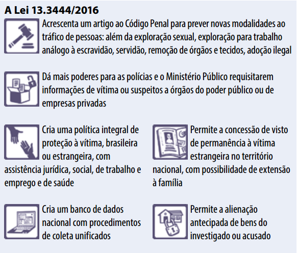 O marco legal amplia o enfrentamento ao tráfico de pessoas trabalhando em três eixos: prevenção, proteção à vítima e repressão. A mudança mais significativa está na proteção, com a criação de uma política completa de assistência às vítimas.