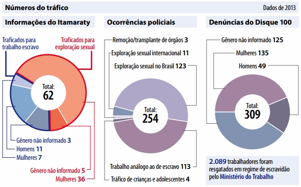O Disque 100, telefone para denúncias da Secretaria de Direitos Humanos, em 2013 registrou 309 vítimas de tráfico de pessoas: 135 mulheres, 49 homens e 125 sem distinção de gênero. Já os dados dos boletins de ocorrência das polícias estaduais indicam a existência de 113 vítimas de tráfico para trabalho escravo no país. Para a exploração sexual, há registros de 123 vítimas locais e 11 para o exterior. São Paulo e Minas Gerais lideram as estatísticas.