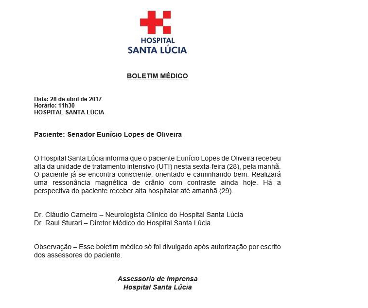 Foi divulgado há pouco um novo boletim médico sobre o estado de saúde do presidente do Senado, Eunício Oliveira. O boletim foi liberado às 11h30 desta sexta-feira (28) pelo Hospital Santa Lúcia, de Brasília.