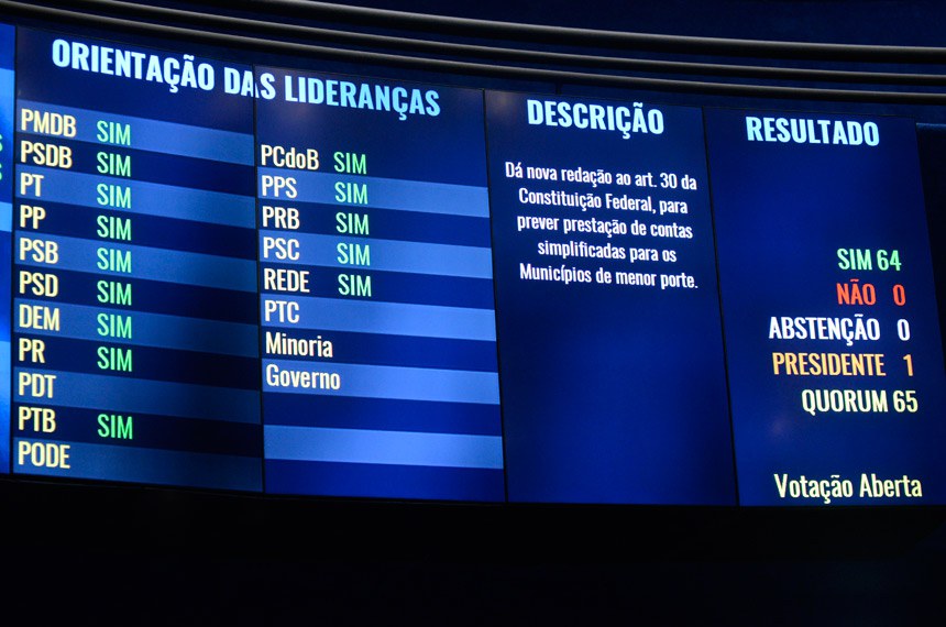 Por unanimidade, com 64 votos, o Plenário aprovou nesta quarta-feira (16), em primeiro turno, a Proposta de Emenda à Constituição (PEC) 77/2015, que prevê prestação de contas simplificada para municípios de pequeno porte. A proposta ainda precisa passar por três sessões de discussão antes da votação em segundo turno. Em seguida, será votada na Câmara dos Deputados.