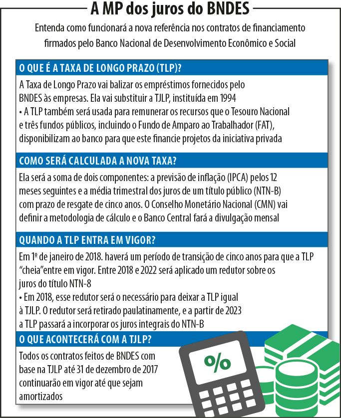 A MP 777/2017 aproxima os juros do BNDES às taxas cobradas pelos bancos privados em financiamentos de longo prazo. A TLP será calculada com base em juros de mercado, mais a variação do Índice Nacional de Preços ao Consumidor Amplo (IPCA).