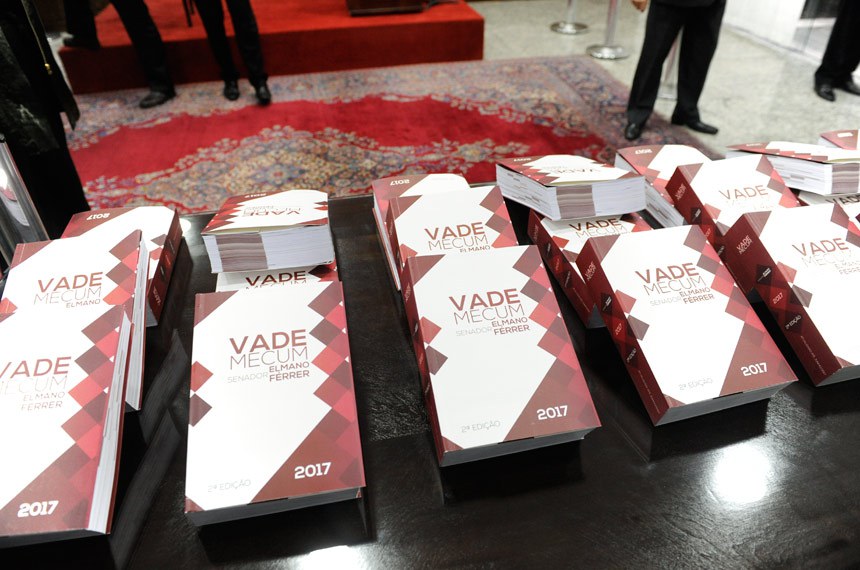 O presidente do Senado, Eunício Oliveira, participou nesta quarta-feira (27) do lançamento da segunda versão de vade mecum organizado pelo senador Elmano Férrer (PMDB-PI). A publicação reúne, em mil páginas, 28 obras de Direito, entre códigos, estatutos e a Constituição. O livro será fornecido gratuitamente a estudantes e interessados na área.