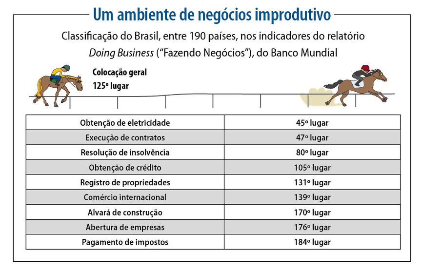 Para Armando, “seria ingênuo supor que existe uma bala de prata” para resolver o problema da produtividade. Segundo ele, porém, há uma série de propostas dispersas que, reunidas, podem reduzir o chamado “Custo Brasil” e tornar o país mais competitivo. O senador citou o recente relatório Doing Business (“Fazendo Negócios”), do Banco Mundial, que situou o Brasil em 125º lugar, entre 190 países, num ranking da qualidade do ambiente de negócios.