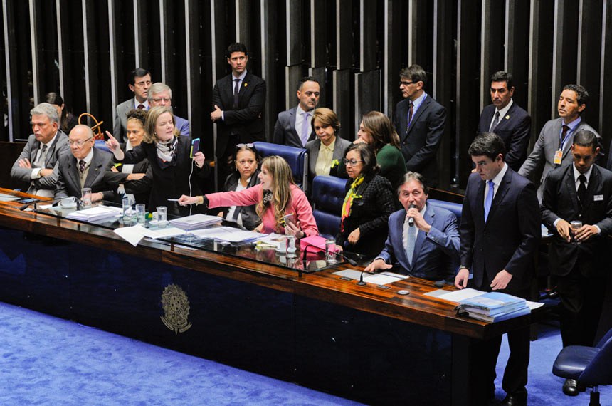 Quando o presidente Eunício Oliveira chegou ao Plenário, um grupo de seis senadoras ocupou a Mesa para tentar impedir a votação. Houve tumulto. Eunício Oliveira suspendeu a sessão, que só foi retomada seis horas depois – com a Mesa ainda ocupada pelas parlamentares.