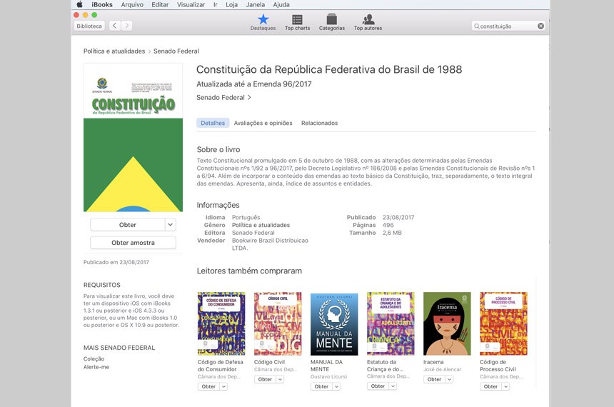 A Constituição brasileira, publicada pelo Senado, é um dos livros que compõem a lista do Top 10 Grátis do iBooks, leitor digital oficial da Apple. No início desta terça-feira (13) a Constituição figurava como o quinto livro gratuito mais baixado pelo aplicativo.