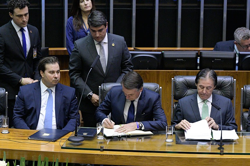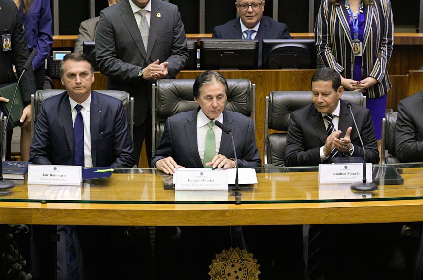 No Plenário, a solenidade foi aberta às 15h02 pelo senador Eunício Oliveira. O parlamentar declarou os dois empossados para o período de 2019 a 2022. Em seguida, o primeiro-secretário do Congresso, deputado Giacobo, leu o termo de posse, que posteriormente foi assinado pelos novos presidente e vice.