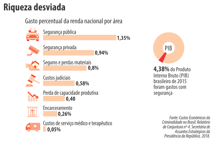 Essa foi a conclusão do relatório da Comissão de Assuntos Econômicos (CAE) que avaliou as políticas públicas do setor de segurança, aprovado em dezembro passado. De acordo com o documento, os crescentes investimentos em segurança pública nos últimos anos não se traduziram em redução de criminalidade. A solução, portanto, não é apenas aumentar os gastos no setor, que drena entre 4% e 5% do Produto Interno Bruto (PIB). (Leia mais sobre o relatório da CAE aqui.)