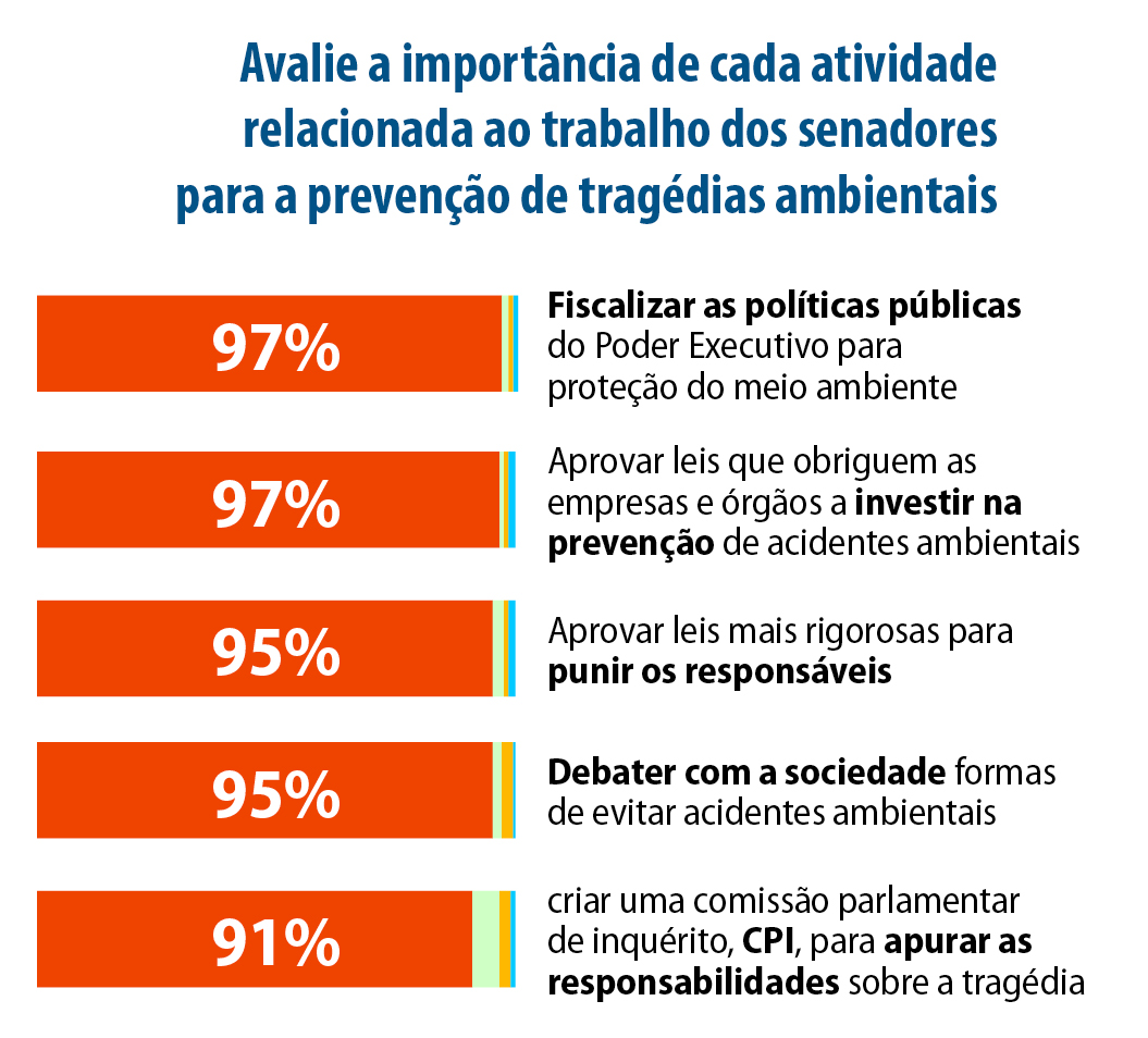 Os brasileiros ouvidos na pesquisa também apoiam a promoção de debates com a sociedade sobre o tema e a criação de comissão parlamentar de inquérito (CPI) para investigar as causas do rompimento da barragem em Brumadinho. Instalada em 13 de março no Senado, a CPI de Brumadinho busca apurar as responsabilidades e propor mudanças na legislação. O colegiado, que funcionará até julho, promoveu audiências públicas com funcionários da Vale e representantes da Agência Nacional de Mineração e da Secretaria de Meio Ambiente de Minas Gerais.