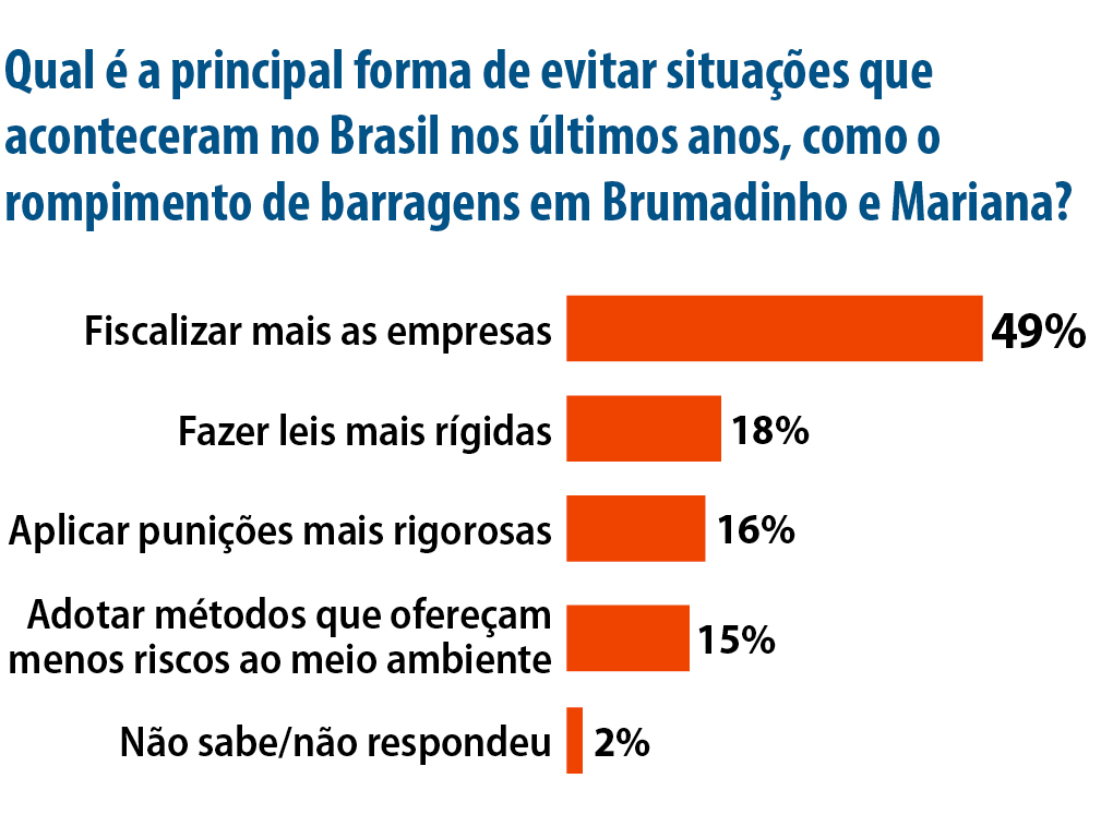 Todas as possíveis iniciativas parlamentares sobre o assunto foram apontadas como relevantes por mais de 90% dos participantes. Para quase metade dos respondentes, a principal forma de evitar novos desastres é fiscalizar mais as empresas, seguida de fazer leis mais rígidas (18%) e aplicar punições mais rigorosas (16%).