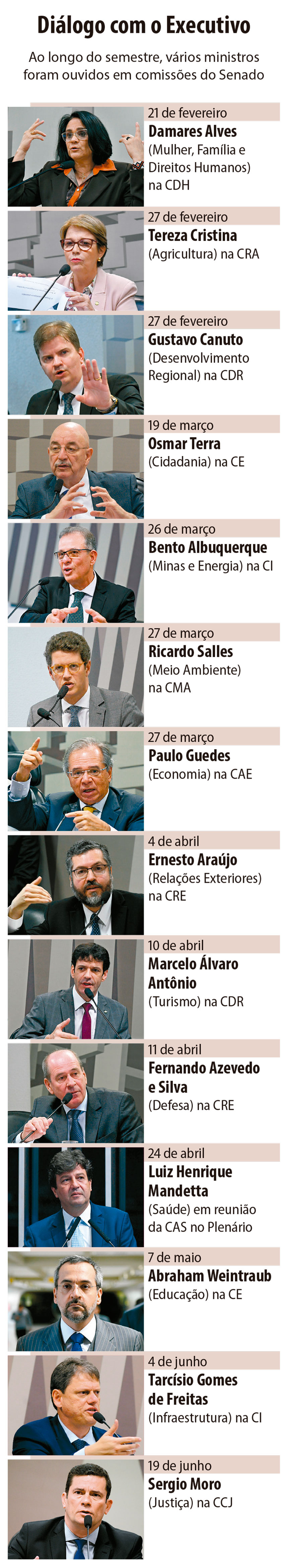 No primeiro semestre de 2019, o Senado recebeu vários ministros de Estado em audiências públicas e cerimônias. Eles compareceram a comissões da Casa para apresentar os planos do novo governo em suas áreas e também para prestar esclarecimentos aos senadores.