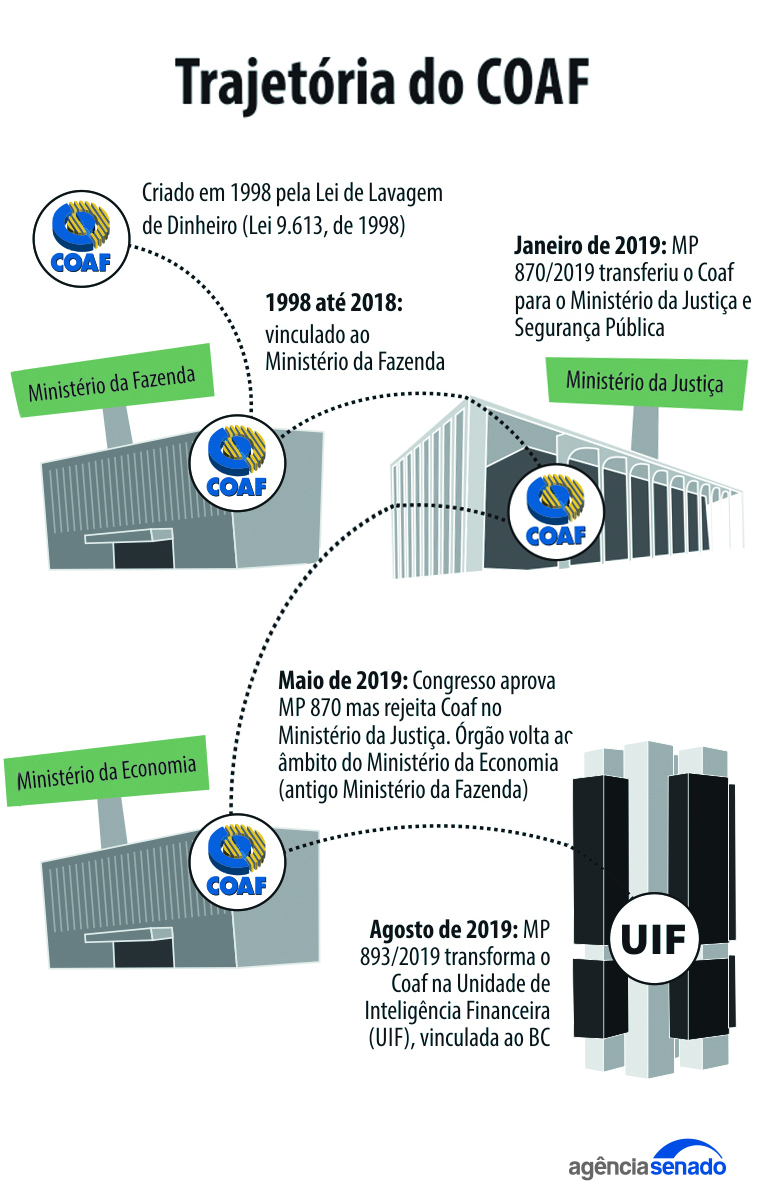 Com a MP 870/2019, além de várias mudanças na estrutura dos ministérios, Bolsonaro transferiu o Coaf para o Ministério da Justiça, como pedido pelo ex-juiz Sergio Moro, que havia terminado de assumir a pasta. O Congresso aprovou a MP, mas recolocou o órgão na pasta econômica. Com a MP 893/2019, o governo fez uma nova transferência do Coaf, que agora será subordinado ao Banco Central.