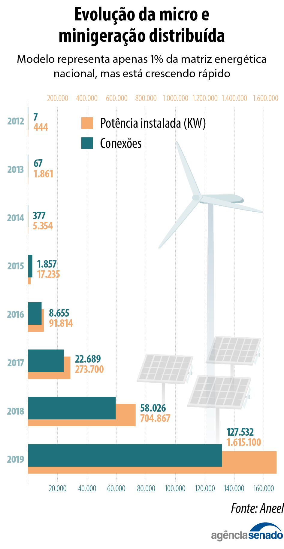 Desde a regulamentação da resolução 482/2012 pela Aneel, foram implantadas mais de 120 mil unidades consumidoras com micro ou minigeração. Mas, conforme a Associação Brasileira de Energia Solar Fotovoltaica (Absolar), isso representa apenas 1% da matriz energética e beneficia 0,2% dos 84 milhões de consumidores brasileiros. Conselheiro da Absolar, Rodrigo Marcolino defende a manutenção das regras atuais para expansão do setor. Ele ressaltou que a geração distribuída, conectada ao sistema elétrico, reduz os custos de geração e transmissão de energia para as concessionárias.