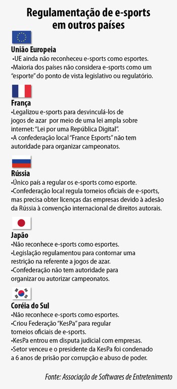 Mario Marconino, da Entertainment Software Association (ESA) — organização que representa de 40 das maiores empresas de videogames do mundo — relatou como funciona a regulamentação dos esportes eletrônicos em outros países. Segundo ele, a maior parte da União Europeia classificou os e-sports em uma categoria diferente dos esportes tradicionais. Na direção oposta, a Rússia enquadrou essas competições e disputas na mesma lei geral de esportes, o que, segundo ele trouxe problemas em relação à propriedade intelectual. Marconino ressaltou que, diferente dos esportes tradicionais, os eletrônicos acontecem numa plataforma que é um produto cuja propriedade intelectual pertence a empresas desenvolvedoras e publicadoras.