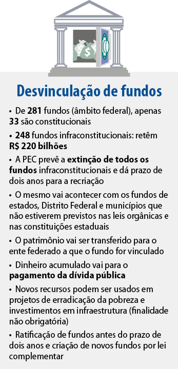 O dinheiro que a PEC pretende liberar está em 248 fundos públicos infraconstitucionais, ou seja, criados por leis e não previstos pela Constituição. Os fundos concentram recursos em atividades ou projetos de áreas específicas, o que significa “amarrar” receitas a determinadas finalidades. Com isso, segundo o governo, o dinheiro fica “engessado” e muitas vezes acaba parado nos fundos enquanto outras áreas sofrem com a falta de recursos.